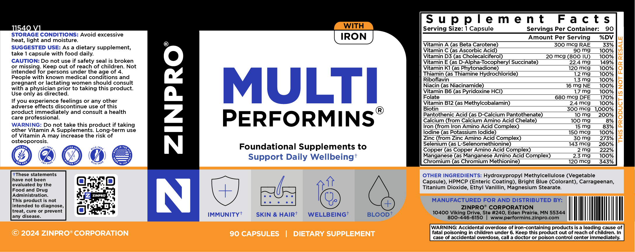 • COMPLETE SUPPLEMENT – Zinpro Multi PerforMins with Iron contains Vitamin A, Vitamin C, Vitamin D, Vitamin E, Vitamin K, Thiamine, Folate, Vitamin B6, Vitamin B12, Biotin, Calcium, Zinc, Manganese, Copper, Chromium, Selenium, Iron and more. Just one capsule daily supports general wellness.†